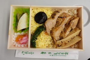 内容は、鶏肉・味噌シソ巻揚、錦糸卵、山菜水煮、笹かまぼこ、椎茸煮、竹の子土佐煮、大根味噌漬け、大根桜漬け、ご飯となっており、健康志向といえば健康志向。
