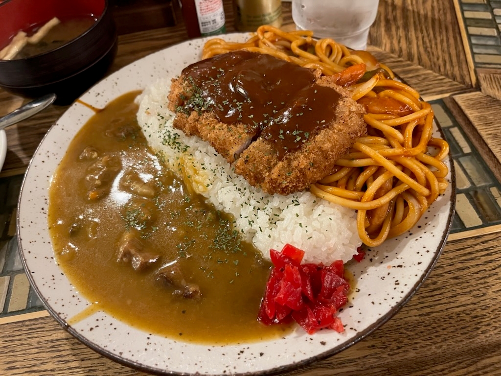 わたくし、てっきりナポリタンの上にデミソースをまとったカツがのっているだけだと思っていたのだが、ご飯にナポリタンが寄りかかり、その上にデミカツ、さらにカレーと福神漬けまで添えられた戦艦大和もはだしで逃げ出すドえらいヤツ、である。