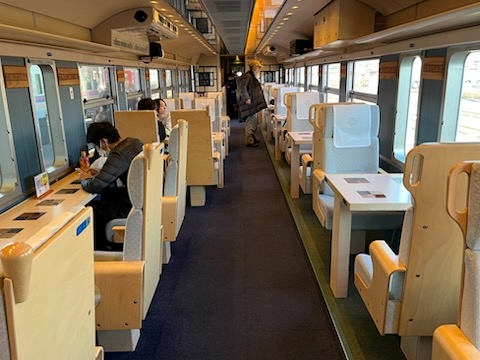 一人客はネットで座席の指定ができないというイミフなシステムであったが、進行方向左側の車窓に向いた指定席を確保。