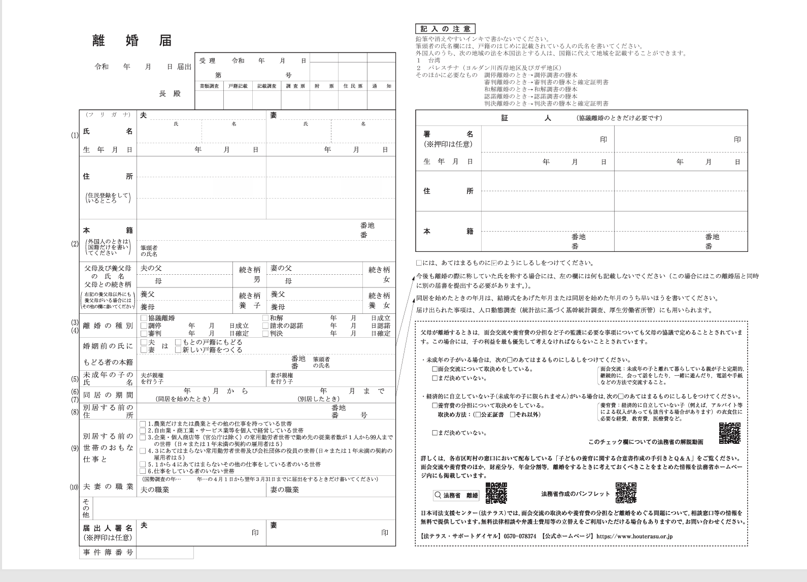 離婚届には、戸籍法の定める必要事項を記載して、離婚する夫婦及び成年の証人2人が署名・押印して、届出人の本籍地又は住所地の市区町村長に提出し、受理されることで成立します。